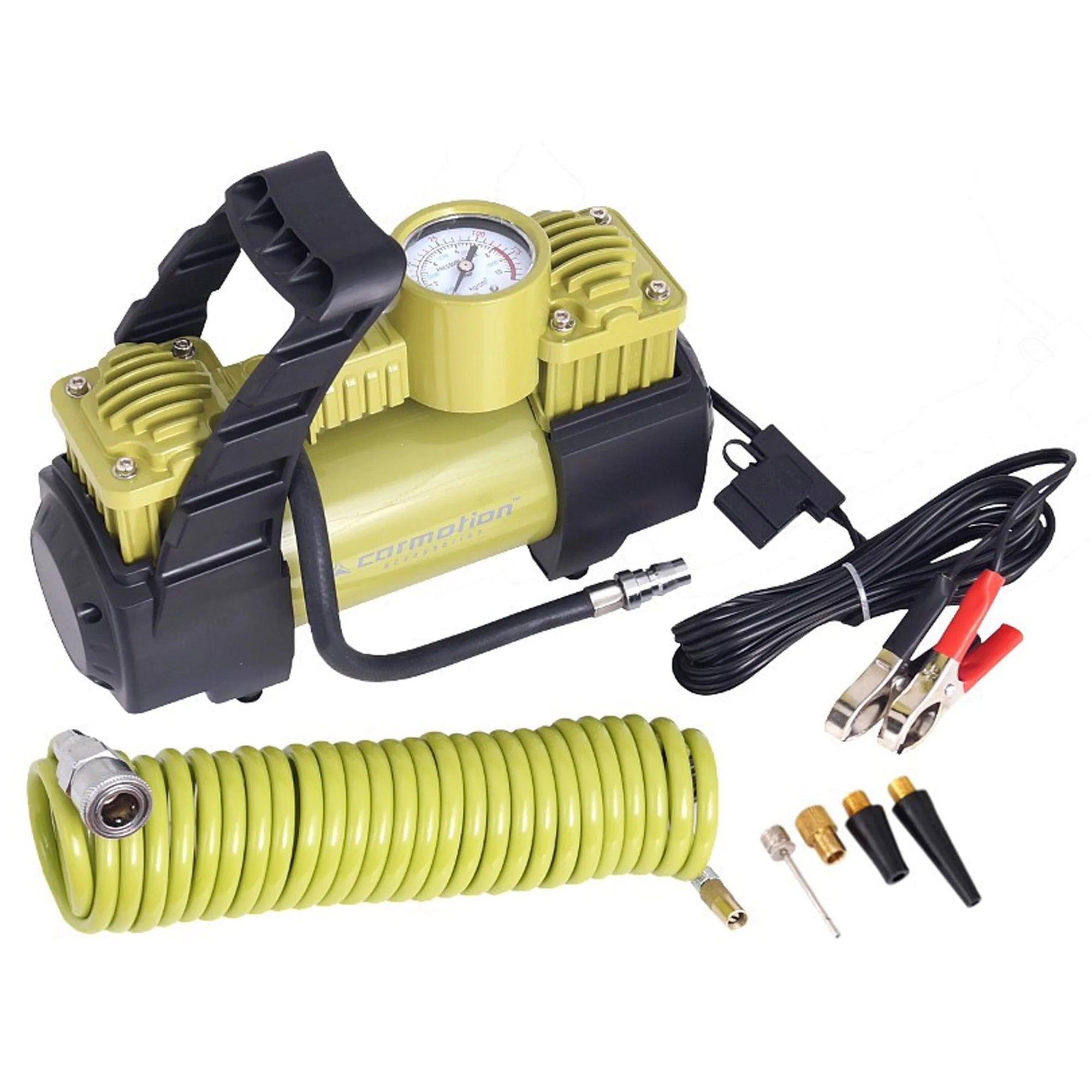 A kompresszorhoz kétféle cső is tartozik, egy 1 méteres gumiból készült, valamint egy 5 méteres spirális kiegészítő, amely lehetővé teszi, hogy könnyedén elérje az összes kereket, még akkor is, ha azok távolabb helyezkednek el az áramforrástól. Az 1 és 5 méteres tömlők segítenek abban, hogy még kényelmesebbé váljon a felfújás, így nem kell közel hajolnia vagy meghajolnia a jármű mellett.