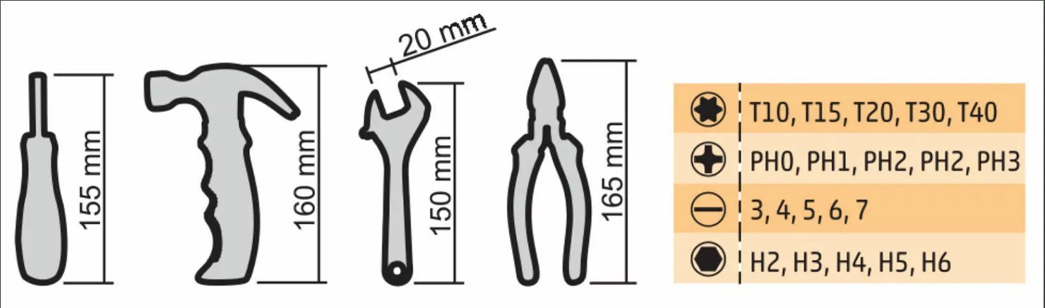 Ta komplet je odlična izbira za vsa osnovna opravila doma, v manjših delavnicah ali na poti. Če iščete zanesljiv in praktičen komplet, ki vsebuje vse najnujnejše pripomočke, je ta 24-delni set prava rešitev.